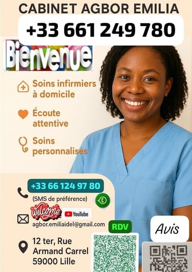 Infirmière diplômée d’État à Lille 59000, Cabinet Agbor Emilia propose des soins infirmiers à domicile 7j/7 : pansements, injections, suivi diabétique et soins post-opératoires. Intervention rapide dans tous les quartiers de Lille.